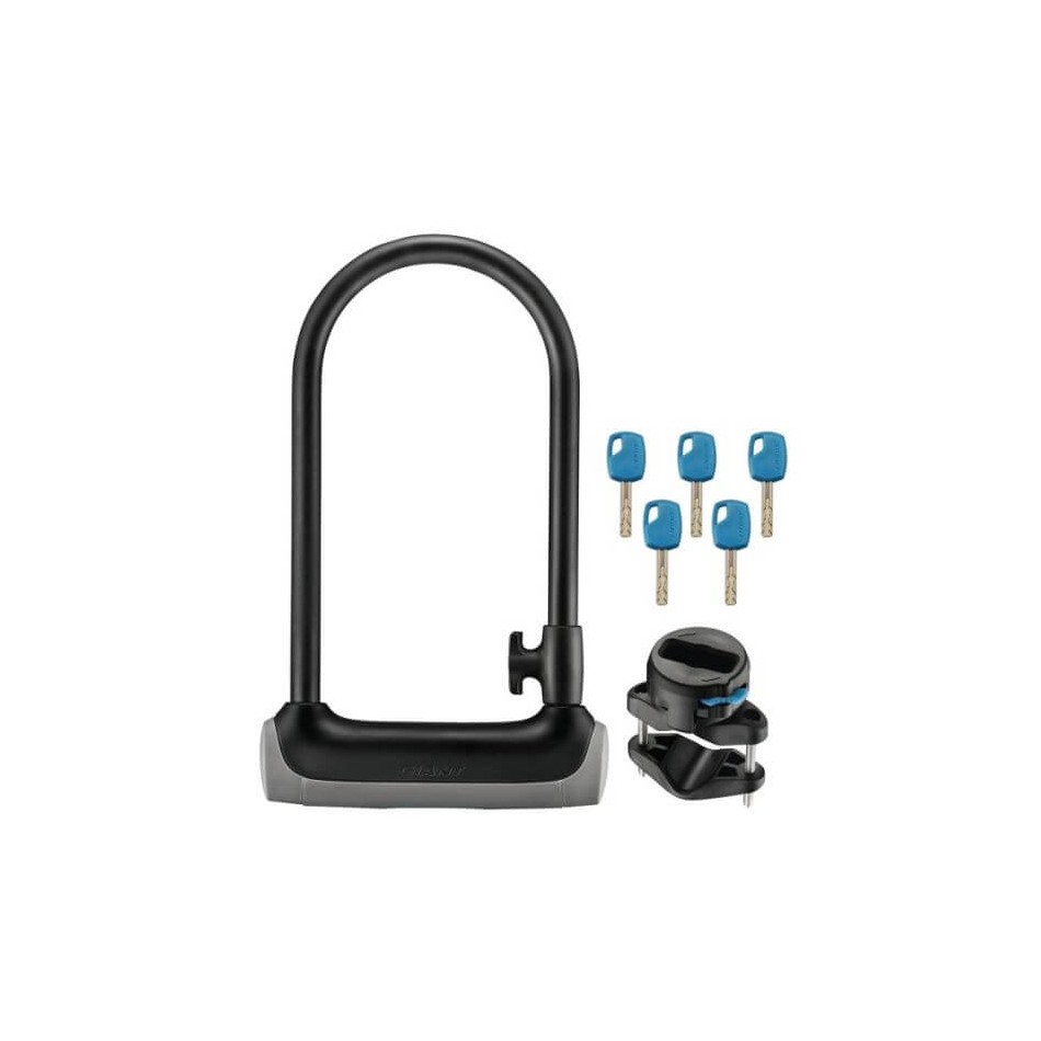 The GIANT Surelock Protector 2 STD lock is a robust and secure option with a 13mm ultra-hardened steel U-shackle and X2P double-bolt mechanism for improved resistance to cutting or twisting attempts. It features the reliable M-Key cylinder, a dust cover, and a QR mounting bracket compatible with 24-40mm frames. It comes with 5 keys, one with an LED light for easy use in low-visibility conditions. A solid solution for protecting your bike with complete confidence.