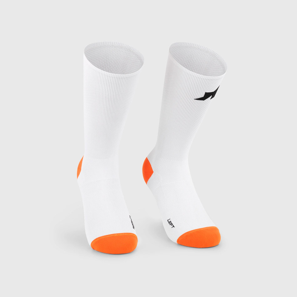 The ASSOS RSR S11 2025 cycling socks feature an ultra-lightweight design and are made with a mid-weight compressive fabric that allows air circulation to wick away heat.