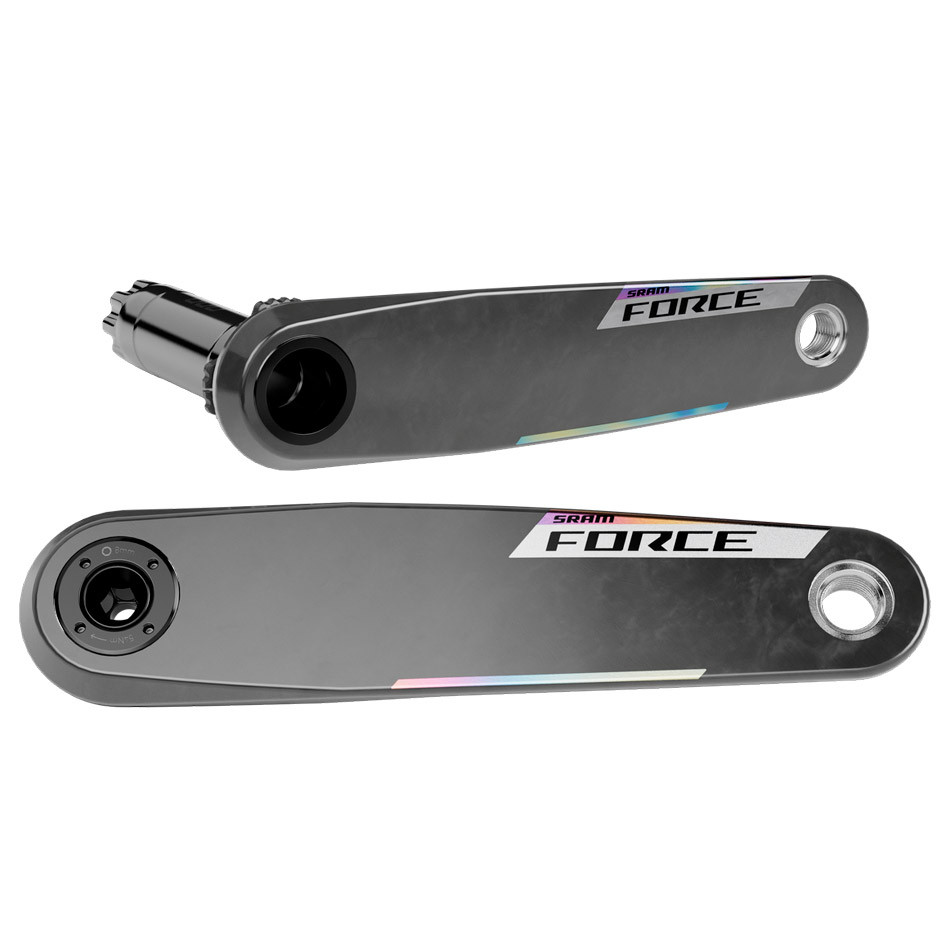 Design and functionality. The SRAM Force AXS E1 carbon crankset is a marvel of design; it's light and stiff, propelling you forward effortlessly. With a 170mm length, wide width, and 8-bolt mount, it's compatible with any SRAM AXS spider or integrated chainring, with or without a power meter. The lightweight, stiff, and durable DUB axle is also compatible with almost any frame.