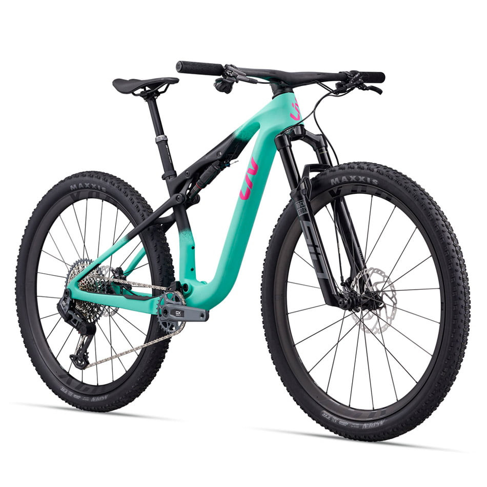 The LIV Pique Advanced SL 1 2026 mountain bike features a full carbon Advanced SL frame and a 120mm FlexPoint Pro suspension system. It's equipped with a SRAM GX AXS drivetrain, RockShox suspension with remote lockout, Shimano Deore XT brakes, and Giant XCR carbon wheels with Maxxis Aspen tubeless tires. This lightweight, agile, and competitive full-suspension bike is ready to tackle any XC or marathon course.