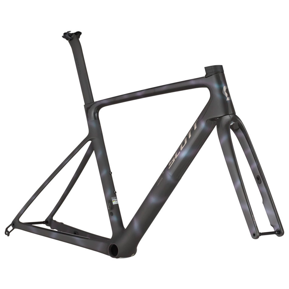 SCOTT Addict RC Ultimate 2025 road frame with HMX SL carbon, the brand's lightest and most advanced frameset. It features a carbon fork and Syncros SP-R100-SL seatpost, also in carbon. Designed for electronic drivetrains and disc brakes, it's the ideal foundation for high-performance builds. Perfect for those looking for an ultralight, competitive bike. An exclusive frameset with very limited availability.