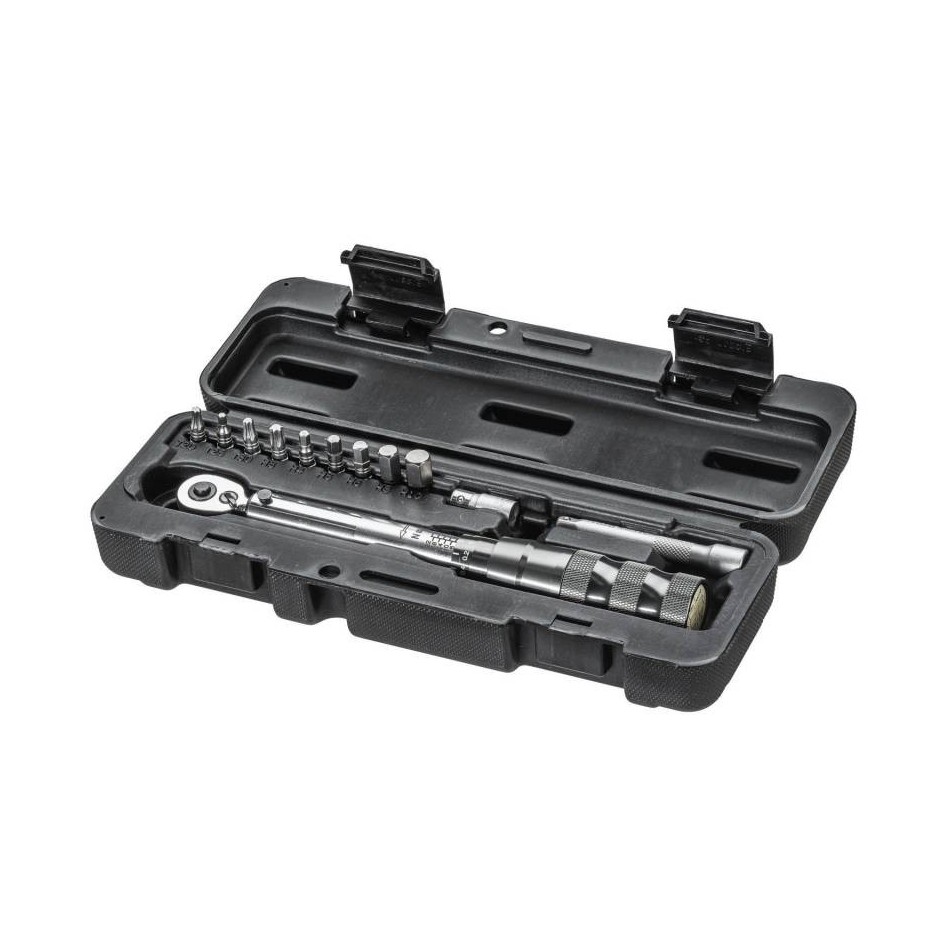 Herramienta dinanométrica ajustable con mango de aleación y llave de 1/4. Rango de apriete 2-24 Nm, Precisión ±4 %. Incluye juego de puntas. NÚMERO DE HERRAMIENTAS: 9. HERRAMIENTAS: Hex 3/4/5/6/8/10, Puntas de tubo T20/T25/T30, Adaptador de tubo de 25 mm y extensión de 75 mm.