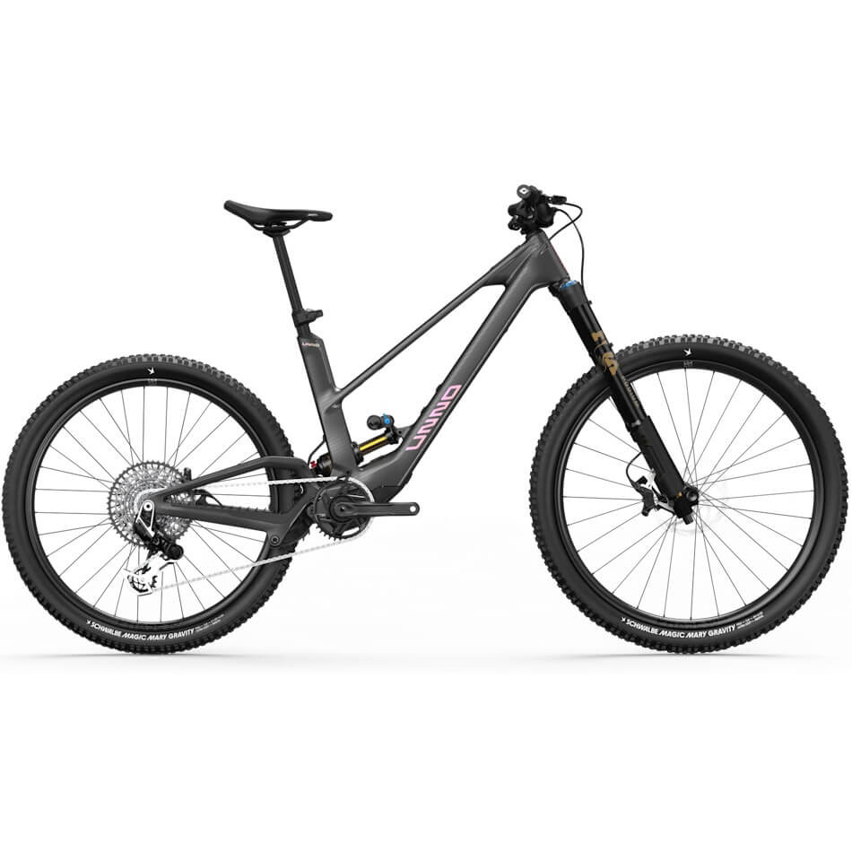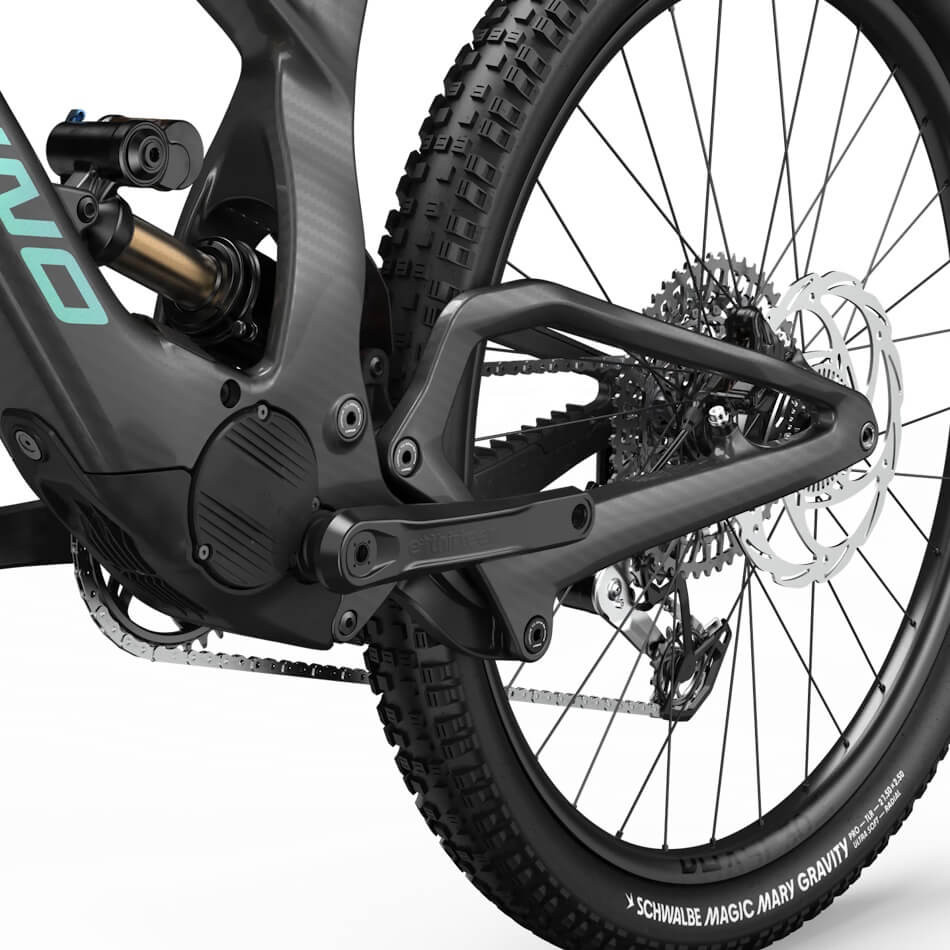 CUADRO Mith de fibra de carbono con 160 mm de recorrido trasero. Sistema de suspensión con pivote virtual. Pantalla integrada, batería, guía de cadena y abrazadera del tubo del sillín. Protector del motor. Rodamientos EnduroMAX. Cableado interno. Eje pasante Boost 12x148. Sistema de frenos Post Mount. Ancho máximo de los neumáticos: 2,6