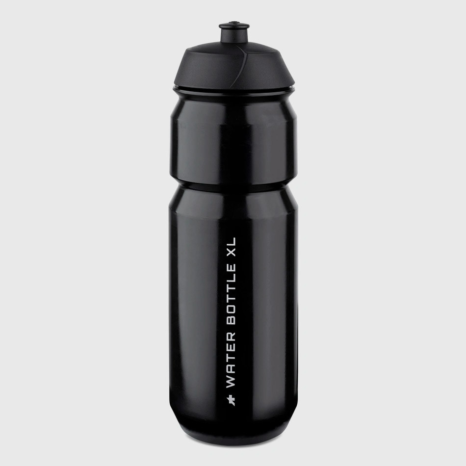 Le bidon de vélo ASSOS Black Series 750 ml Signature présente une conception flexible sans BPA et est compatible avec n'importe quel porte-bidon du marché.