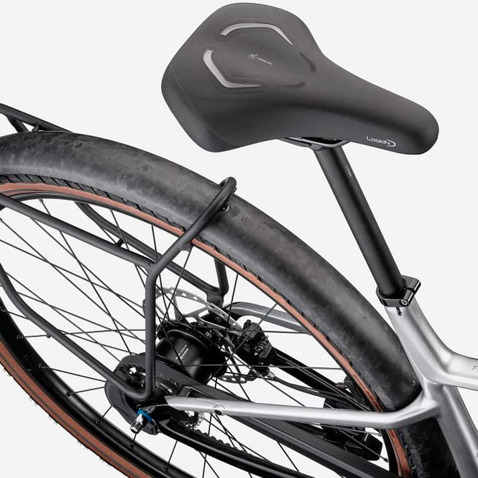Cadre FlyingV, construction légère en carbone, batterie intégrée au tube diagonal, passage de câbles interne, pattes de cadre de 135 mm, jeu de direction de 1,5", frein à fixation plate, support de béquille amovible (type Pletscher 40 mm), support caché pour traceur Bluetooth (Chipolo, Airtag, etc.)