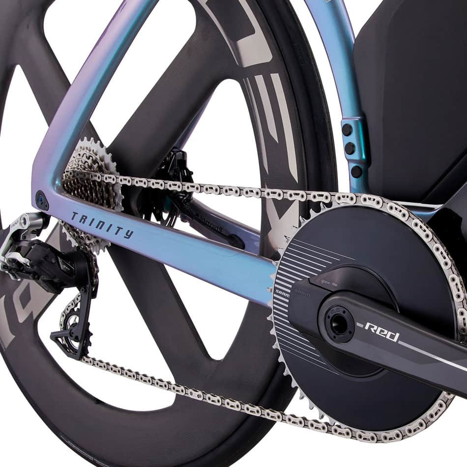 Bici da triathlon GIANT Trinity Advanced SL 0 2026 con telaio e forcella in carbonio Advanced SL-Grade. Dotata di gruppo elettronico wireless SRAM RED AXS, misuratore di potenza SRAM integrato e freni idraulici. È dotata di ruote in carbonio CADEX 4-Spoke Disc WheelSystem, cockpit AeroDrive con estensioni personalizzabili e sella Giant Contact SL Tri. Una vera macchina da cronometro con la massima integrazione, aerodinamica e precisione elettronica. Progettata per chi compete ai massimi livelli e non lascia nulla al caso.