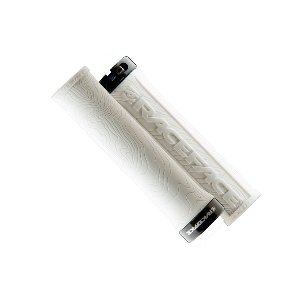 Los puños para ciclistas Race Face Half Nelson Single Lock en color blanco cuentan con un compuesto súper adherente, suave y duradero con un diseño de perfil bajo y con canales de humedad topográficos.