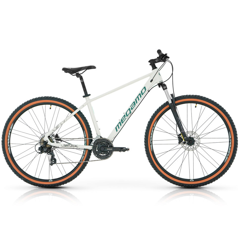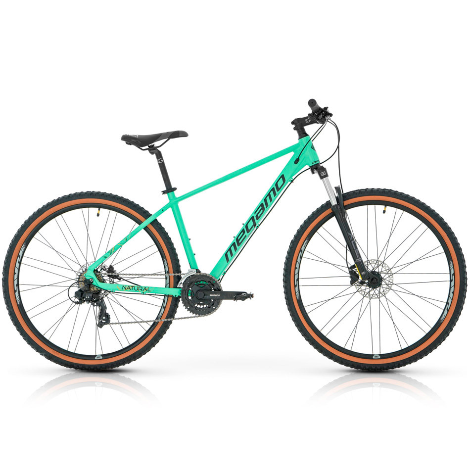 Bicicletta MEGAMO Natural 60 27 2026 con telaio in alluminio 6061 idroformato, doppio spessore e passaggio cavi interno, progettata per chi si avvicina per la prima volta alla MTB, con sicurezza e controllo. Dotata di forcella Suntour XCE da 100 mm, trasmissione Shimano a 21 velocità, freni idraulici Shimano MT200 e ruote in alluminio con pneumatici MTB da 29 pollici. Una scelta ideale per i tuoi primi percorsi in montagna, comoda e affidabile.
