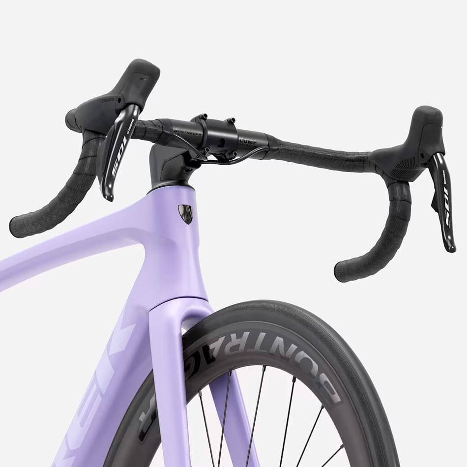 GUIDÃO Tamanho XS: Bontrager Comp, liga, 31,8 mm, deslocamento de 80 mm, queda de 121 mm, alavancas de 36 cm, extremidades de 40 cm; Tamanho S, M: alavancas de 38 cm, extremidades de 42 cm; Tamanho ML, L: alavancas de 40 cm, extremidades de 44 cm; Tamanho XL: alavancas de 42 cm, extremidades de 46 cm