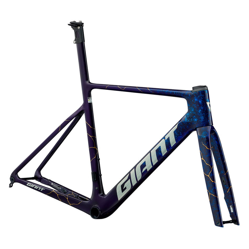Quadro aerodinâmico GIANT Propel Advanced SL 2026 em carbono Advanced SL-Grade com canote integrado e garfo totalmente em carbono. Projetado para freios a disco e eixos passantes, combina rigidez, leveza e aerodinâmica em um acabamento espetacular Kintsugi Blue/Chrome. A escolha perfeita para construir uma máquina de corrida de alto desempenho.